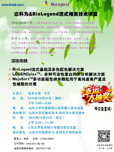 10月22日至23日,分別由山東大學齊魯醫院 山東大學免疫所和達科為生物濟南辦共同承辦的流式專家講座,在山東大學齊魯醫院心血管三樓會議室和六號樓五層會議室如期舉行。