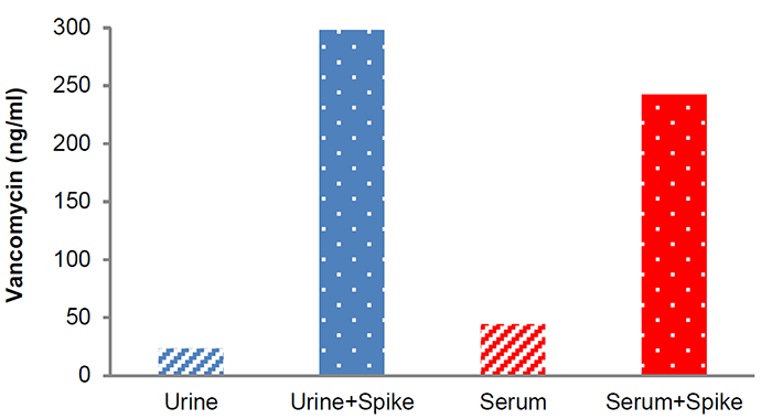 加標回收實驗人血清和尿液樣本加300ng/ml的萬古霉素,回收率為80-100%。