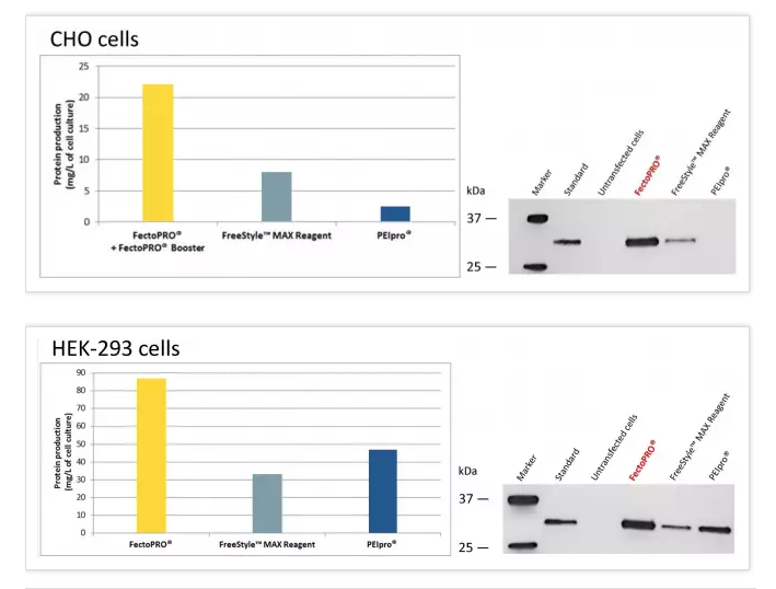 圖2. FectoPRO?大幅提高懸浮CHO和HEK-293細(xì)胞的蛋白產(chǎn)量。按1×106個(gè)細(xì)胞/ml的密度將FreeStyle? CHO-S和HEK-293F細(xì)胞培育在30 ml的無(wú)血清培養(yǎng)基中,并依照每種試劑說(shuō)明書(shū)推薦用量FectoPRO?+FectoPRO?輔助藥劑Booster (0.4 μg DNA/ml)、FreeStyle?MAX試劑(1.25 μg DNA/ml)或PEIpro?(1 μg DNA/ml)進(jìn)行轉(zhuǎn)染。用蛋白質(zhì)G親和性定量法(HPLC)和Western Blot檢測(cè)轉(zhuǎn)染后72小時(shí)(CHO細(xì)胞)和120小時(shí)(HEK-293細(xì)胞)的IgG3-Fc (34 kDa)的產(chǎn)量。