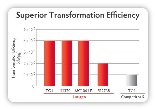 Figure 1. Transformation efficiency of Lucigen's electrocompetent bacterial cells for phage display compared to competitor's specification.