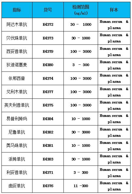 一些常用的生物仿制藥抗體ELISA試劑盒: