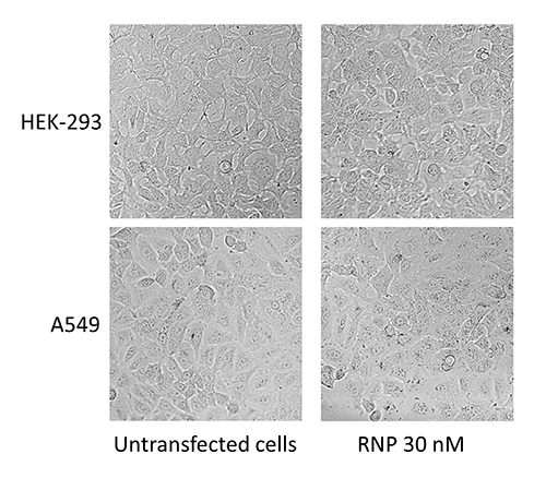 在96孔板中用30nm RNP(Cas9蛋白和HPRT1 sgRNA)和0.3 μl的jetCRISPR?轉染HEK-293和A549細胞,轉染48h后,使用phase contrast ZOE Fluorescent Cell Imager (BIORAD?)觀察細胞狀態(tài)。