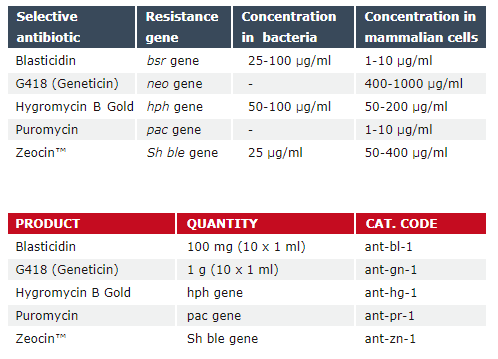 InvivoGen的篩選抗生素可與其他篩選抗生素或與細胞培養過程中預防支原體,細菌,真菌污染的抗微生物抗生素聯合使用。有不同的規格可供選擇。