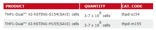 THP1-Dual? KI-hSTING-S154細胞和THP1-Dual? KI-hSTING-M155細胞均來自THP1-Dual? KO-STING細胞,該細胞衍生自THP-1細胞,穩定敲除了內源性人源STING的雙等位基因并穩定整合了兩種可誘導分泌的報道基因(Lucia螢光素酶和SEAP(分泌型胚胎堿性磷酸酶)。THP1-Dual? KO-STING細胞敲入了“野生型”R232人源STING突變體[3]的無內含子編碼序列和一個S154 或M155突變位點。IRF3和NF-κB通路能夠通過分別測試Lucia熒光素酶或SEAP活性進行檢測。細胞培養上清中的報告基因蛋白活性能夠使用QUANTI-Luc? and QUANTI-Blue?檢測試劑進行檢測。SAVI報告基因細胞對Blasticidin和Zeocin?有抗性。