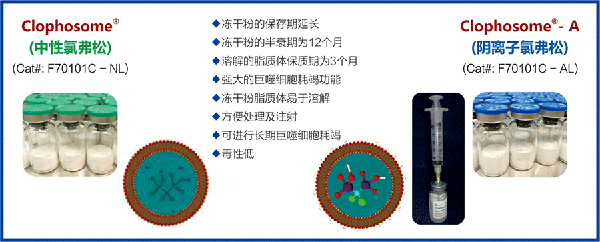 為了延長脂質體的保質期,廠家已成功推出凍干粉狀的Clophosome?產品,其質保期已延長至12個月。通過簡單的溶解,即可成功獲得氯磷酸鹽脂質體。同樣,凍干粉狀的Clophosome?保持了與液態Clophosome?同樣杰出的巨噬細胞耗竭功能,以及活性高,使用方便,無菌無毒,以及高濃度,高包封率,不粘稠,無沉淀,易于注射等諸多優越性能,尤其是凍干粉狀的Clophosome?克服了脂質體保質期短,穩定性差的缺陷。