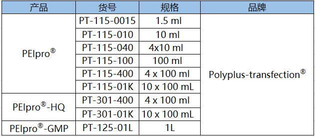 表1.Polyplus-transfection?提供一系列不同級別PEIpro?,滿足從工藝開發、臨床前、到臨床級別病毒載體的生產需求