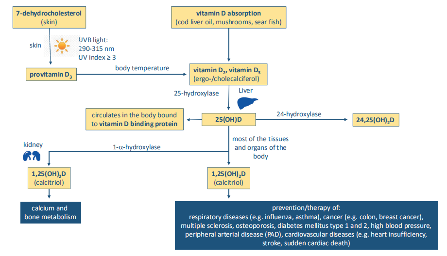 由于冬季紫外線水平低,維生素D的自我合成減少。這會增加所有類型的感染,例如呼吸道合胞病毒(RSV),流感病毒和SARS-CoV。在熱帶地區,這種季節性是與雨季有關。不同的研究報告說,在慢性病患者中25-(OH)D3的濃度低于健康人。