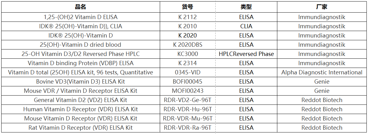 下表列舉了部分與Vitamin D檢測相關的產品清單: