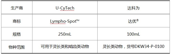 目前,我們同時提供U-CyTech原產(chǎn)的Lympho-Spot?無血清培養(yǎng)基和U-CyTech授權(quán)達科為在國內(nèi)生產(chǎn)的達優(yōu)?無血清培養(yǎng)基。它們的原料來源與質(zhì)控標(biāo)準(zhǔn)完全相同,能獲得同樣出色的檢測結(jié)果。由于物種的差異,部分添加成分在靈長類和嚙齒類之間有差別。U-CyTech公司采取了同時添加的策略,所以生產(chǎn)出的是通用達優(yōu)?無血清培養(yǎng)基;達科為公司采取的是分別添加的策略,所以生產(chǎn)出的是專用達優(yōu)?無血清培養(yǎng)基,分靈長類和嚙齒類兩個品種。詳細的差別見下表。