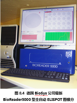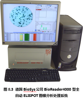 德國Bio-Sys公司從上世紀80年代開始就致力于生物圖像識別領(lǐng)域,在進入ELISPOT圖像分析儀市場后一直以其先進的ELISPOT斑點識別技術(shù)聞名。德國Bio-Sys公司首先解決了顯微攝像系統(tǒng)難以定位96孔板上的每一個孔的問題。其解決方法基于圖像識別技術(shù),利用板孔邊壁和真正的孔底的細微差別,在機械定位的基礎(chǔ)上,通過軟件識別來進一步提高每孔的定位精度。是目前市場上所有ELISPOT圖像分析儀中唯一能夠完整識別整個孔底ELISPOT斑點圖像的設(shè)備。在對真假斑點的分辨中,德國Bio-Sys公司除了具備完善的物理學多參數(shù)識別技術(shù),還特別針對ELISPOT斑點形成的生物學過程,通過細胞因子顯色后的“光密度”峰值積分分析方法,精確分辨真假斑點、融合斑點等復(fù)雜情況。Bioreader系列ELISPOT圖像分析儀國外大多數(shù)較有經(jīng)驗的ELISPOT實驗室推崇的特點為:專業(yè)性和參數(shù)全開放性。因為ELISPOT實驗的復(fù)雜性,ELISPOT斑點形成在不同的實驗條件下有非常大的差異。這就對ELISPOT圖像分析儀提出了較高的要求:既要能夠保證斑點計數(shù)的真實性和一致性,又要能夠根據(jù)不同情況,通過實驗者的判斷來校正儀器對ELISPOT斑點識別的標準。要同時實現(xiàn)以上兩個要求,唯一的辦法是將儀器的所有判斷標準向ELISPOT實驗者開放,實現(xiàn)實驗者和儀器的互動。在這一方面,德國Bio-Sys公司始終走在ELISPOT斑點識別領(lǐng)域的前列,新的Bioreader-4000型(圖8.3)和Bioreader -5000(圖8.4) 型在專業(yè)性和適用性方面都領(lǐng)先于其他廠家的設(shè)備。