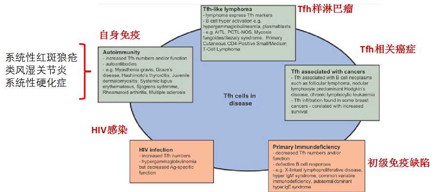 因此,基于 Tfh 細胞的功能特性,其與多種疾病密切相關。 Tfh 細胞及相關分子的缺陷會導致正常的 B 細胞反應不能完成,產生體液免疫缺陷。相反, Tfh 功能亢進也會導致病態的自身免疫反應,介導自身免疫病的發生。目前對 Tfh 的研究也主要集中在其與自身免疫疾病和 HIV 的關系上面。