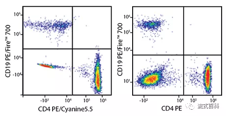 在5激光Cytek? Aurora 光譜流式平臺上,檢測人裂紅后外周血的CD4和CD19。PE/Fire? 700-CD19和PE/Cyanine5.5-CD4共染方案與PE/Fire? 700-CD19和PE-CD4共染方案得到了相似得陽性信號,說明在光譜流式平臺PE/Fire? 700和PE/Cyanine5.5是有可能在一個(gè)panel中共用的,但是配色方案可以更加優(yōu)化。